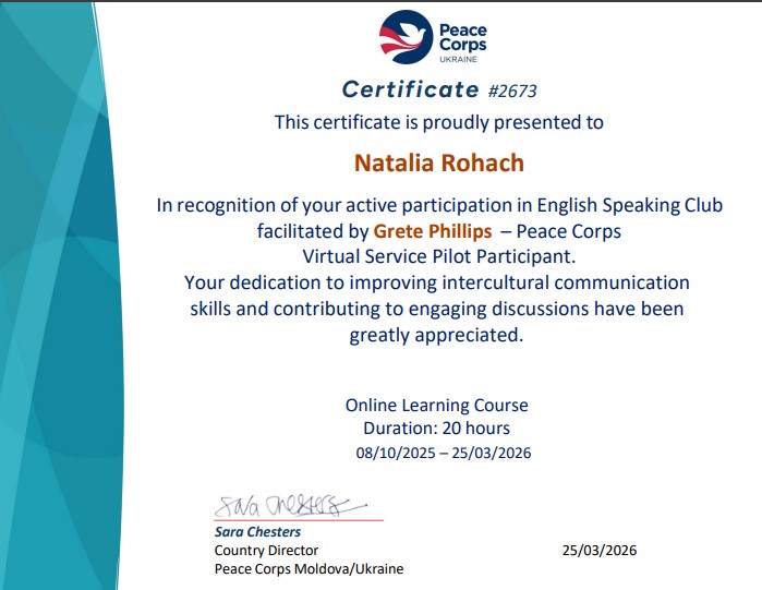 Протягом шести місяців учасники працювали під керівництвом досвідченої волонтерки Корпусу Миру Grete Phillips. Формат навчання дозволив зануритися у живе мовне середовище. «Співпраця з Корпусом Миру – це унікальна можливість не тільки вдосконалити власну англійську, а й принести нову енергію та нові методики у наші аудиторії. Це безпосередньо впливає на якість підготовки молоді», –зазначає Наталія Рогач. Участь у проектах такого рівня підтверджує прагнення педагогів до самовдосконалення, освіти – до євроінтеграції.